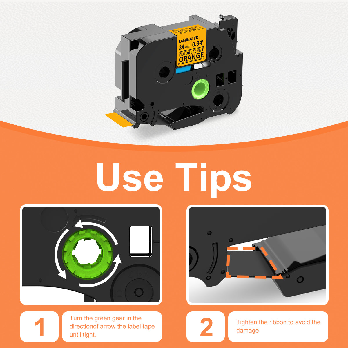- Kindly note: To keep the tze-b51 orange label tape with adhesion, please make sure that the sticking surface is clean and flat before labeling. These replacement ptouch tape 24mm can stick very well to smooth surfaces, including paper, plastic, steel, wood and more.