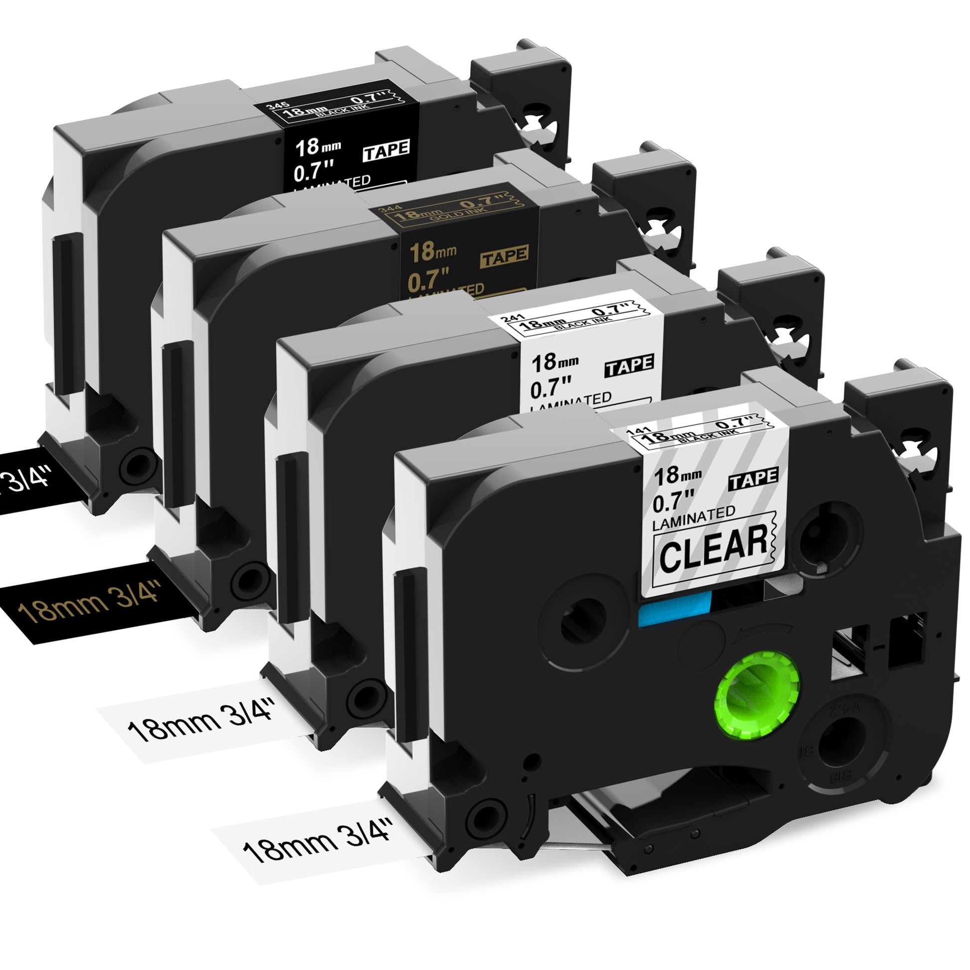 - 4 Pack Compatible with Brother Ptouch 18mm label tape TZe-241 (TZe241, TZ-241) Black on White , TZe-141(TZe141, TZ-141) Black on Clear, TZe-344 Gold on Black, TZe-345 White on Black. Each Width: 3/4 inch (18mm 0.7 inch) , Length: 26.2 feet (8 meter) for each 18mm label tape