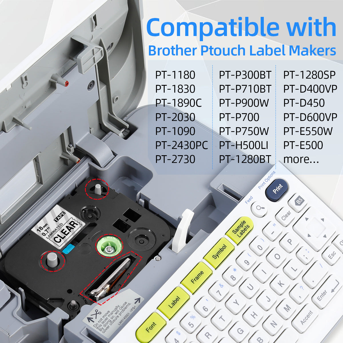 - Compatible with Brother Ptouch label makers that use up to 18mm 0.7 inch TZe label tape: PT-D400, PT-D600, PT-D400AD, PT-D400VP, PT-D600VP, Compatible with PTouch Plus PT-P710BT, PT-P750W, PT-E550W, PT-P700, PT-2730VP, PT-H500LI, PT-2730, PT-2430PC, PT-D450, PT-1880, PT-1830, PT-1890SC, PT-2300, PT-300, PT-310, PT-E300, PT-E300VP, PT-E500, PT-E550W, PT-520, PT-530, PT-540, PT-550, PT-1400, PT-1500, PT-1500PC, PT-1600, PT-2110, PT-2200, PT-2210, PT-2300, PT-2310, PT-2400, PT-9700PC more.