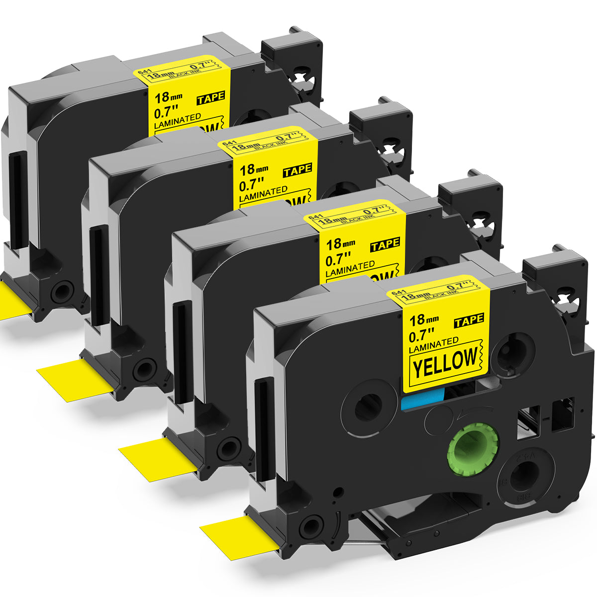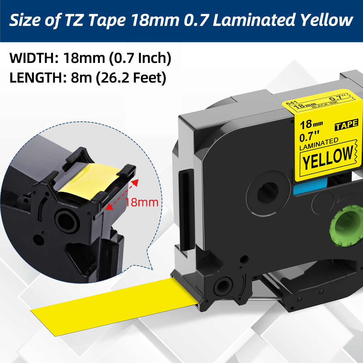- Package includes 4-Pack Labelife label tape replacement for Brother P Touch 18mm label tape TZe-641 (TZe641, TZ-641). Width: 3/4 inch (18mm 0.7 inch). Length: 26.2 feet (8 meter) for each TZe-641 label tape, 104.8 feet for 4-Pack TZe-641 label tapes. Color: Black on Yellow