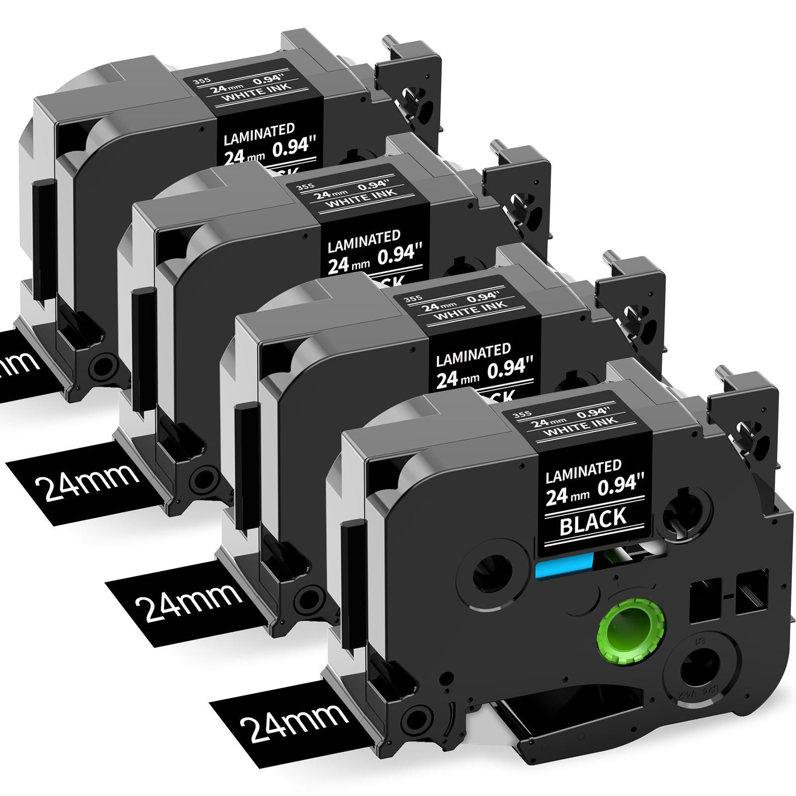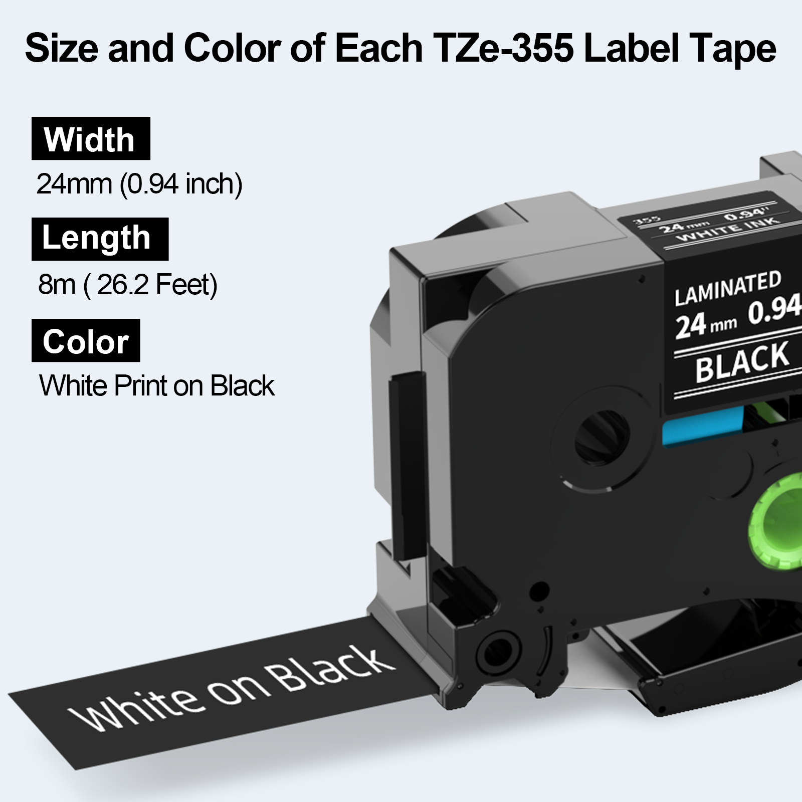 - Package includes 4-Pack replacement for Brother 24mm label maker tapes TZe-355 (TZe355, TZ-355 TZ355). Width: 1 inch (24mm 0.94 inch). Length: 26.2 feet (8 meter) for each TZe-355 label tape, 104.8 feet for 4-Pack TZe-355 label tapes. Color: White on Black