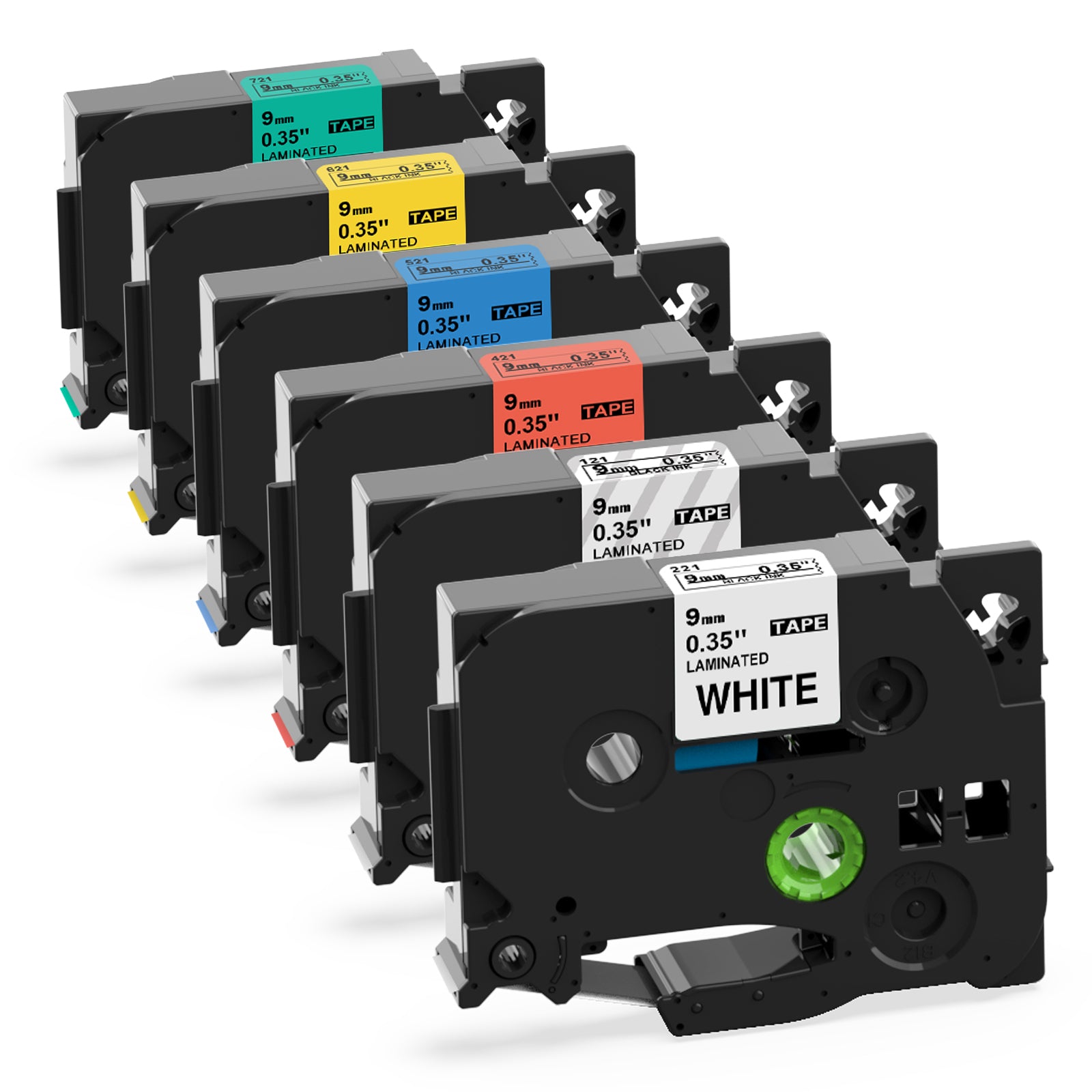 - Package includes 6-Pack replacement for Brother P Touch 9mm label tapes. Model: Replace TZe-121 TZe-221 TZe-421 TZe-521 TZe-621 TZe-721. Width: 9mm 0.35 inch (3/8 inch). Length: 26.2 feet (8 meter) for each 9mm TZe label tape, 157.2 feet (48 meter) for 6-Pack 9mm TZe label tapes. Color: Black Print on Transparent/White/Red/Blue/Green/Yellow