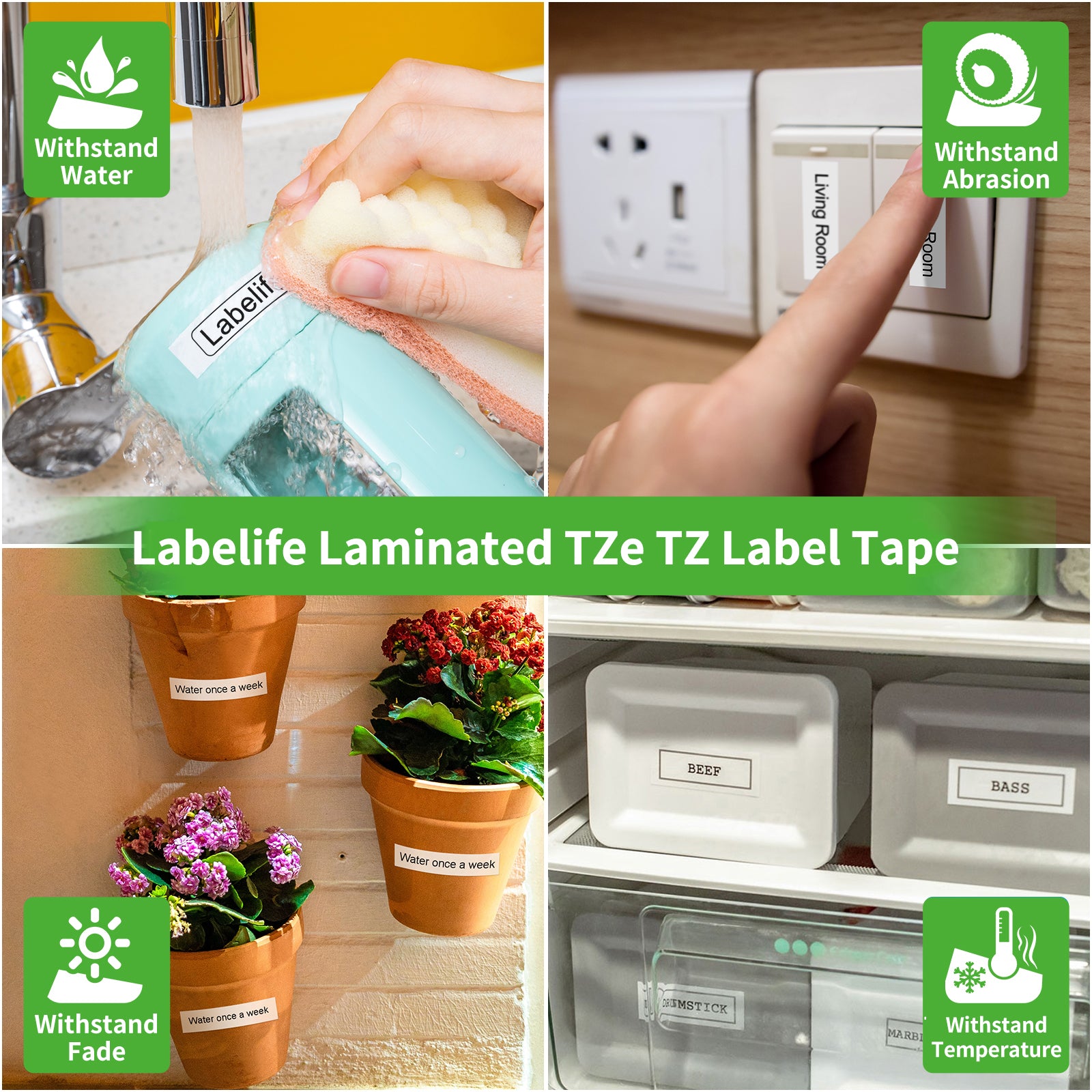 - The backing is split lengthways in the middle for easy peeling. These compatible Brother P Touch TZe TZ Tape 9mm 0.35 inch label tapes are laminated. These label maker tapes can withstand water, fade, temperature and abrasion. The labels will not fade or smudge.