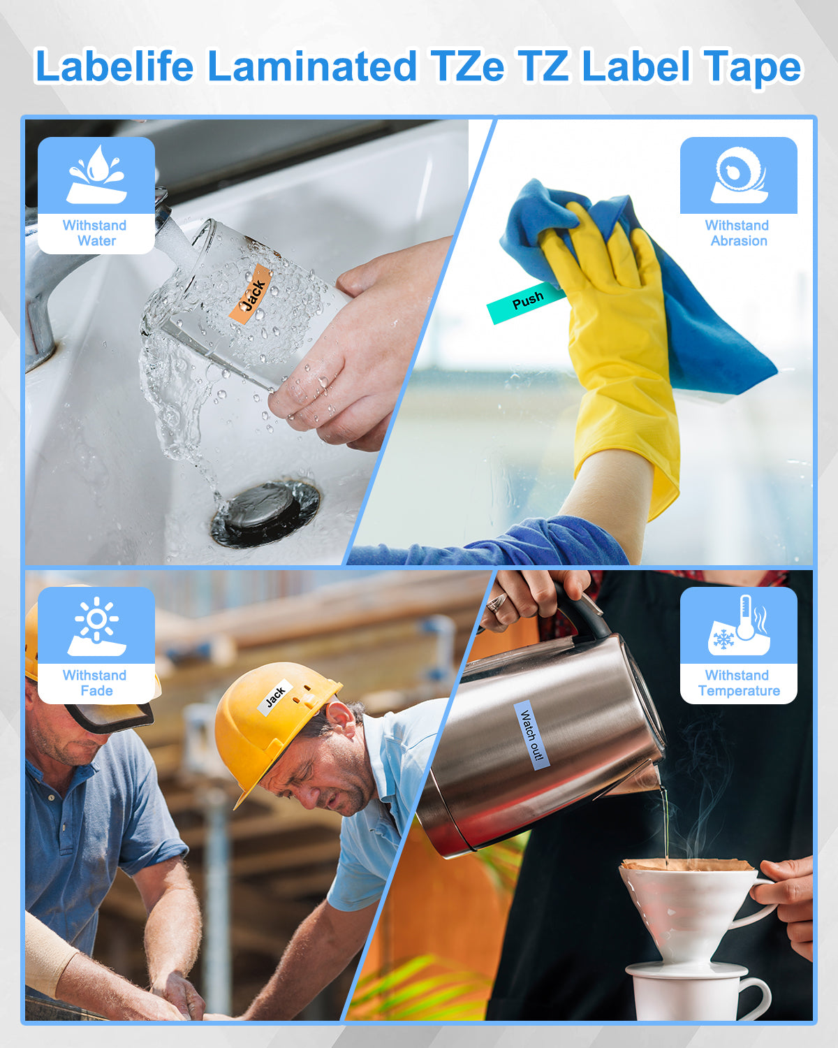 - These replacement Brother P Touch label tapes are laminated, which are suitable for indoors and outdoors. These compatible Brother P Touch TZe label tapes can withstand water, fade, abrasion and temperature