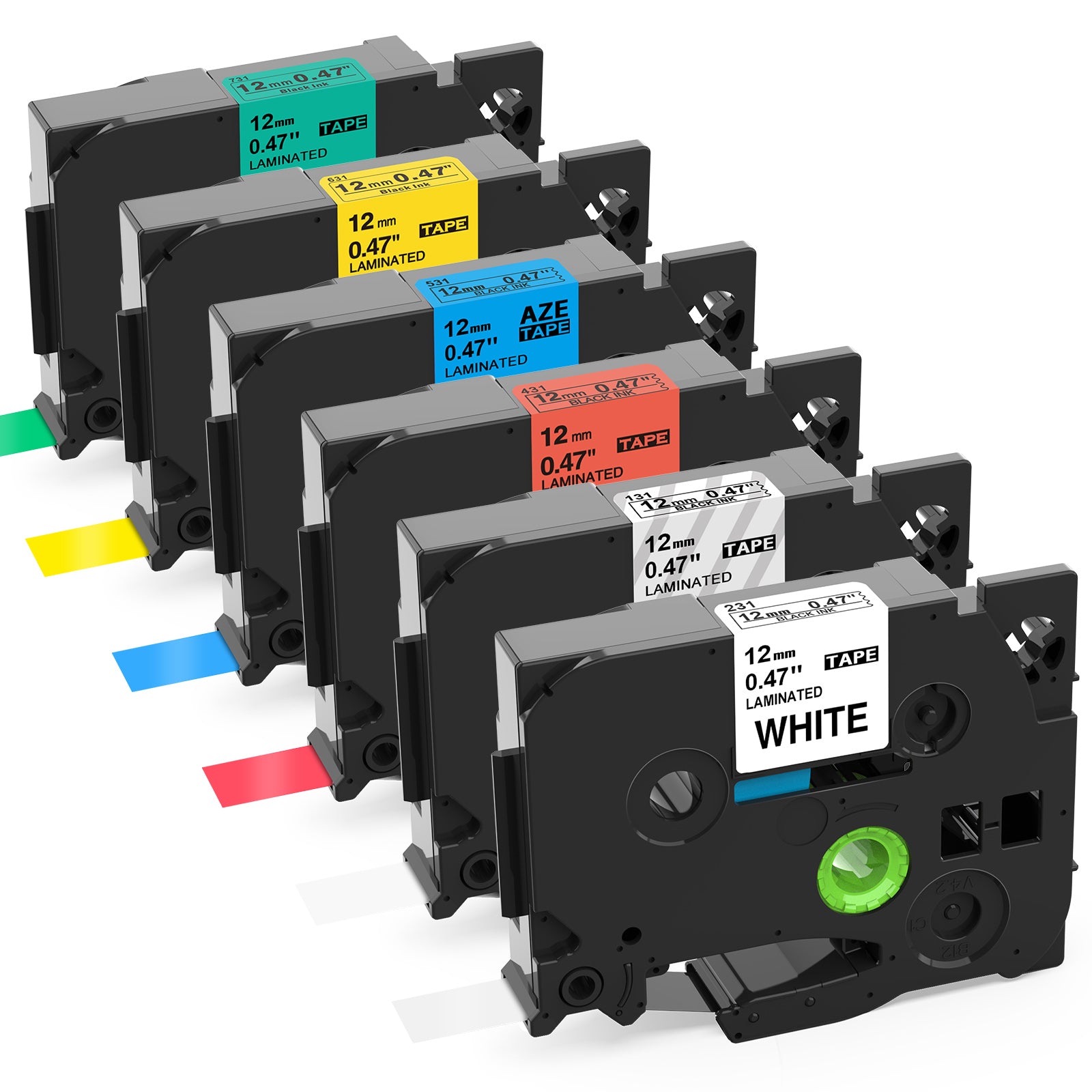 - Package Includes: 6-Pack compatible label tapes replacement for Brother P Touch TZe label tapes TZe-231 TZe-131 TZe-431 TZe-531 TZe-631 TZe-731 (Not original). 6 Colors in one set for better labeling: Black on White/Clear/Red/Blue/Yellow/Green. Width: 1/2 inch (12mm 0.47 inch). Length: 26.2 feet (8 meter) for each label tape, 157.2 feet for 6-Pack
