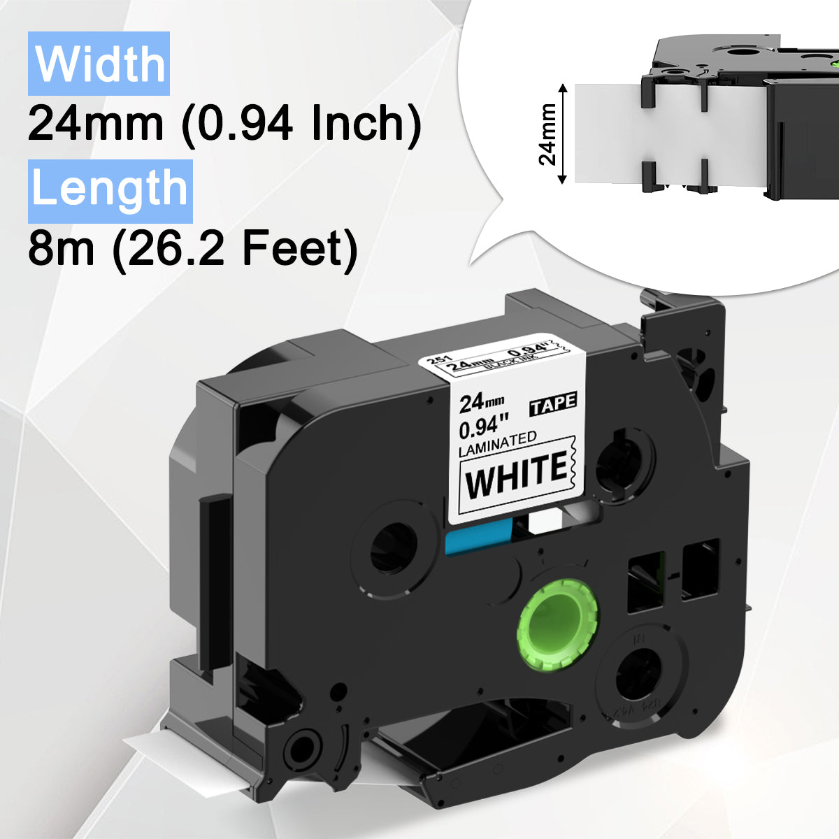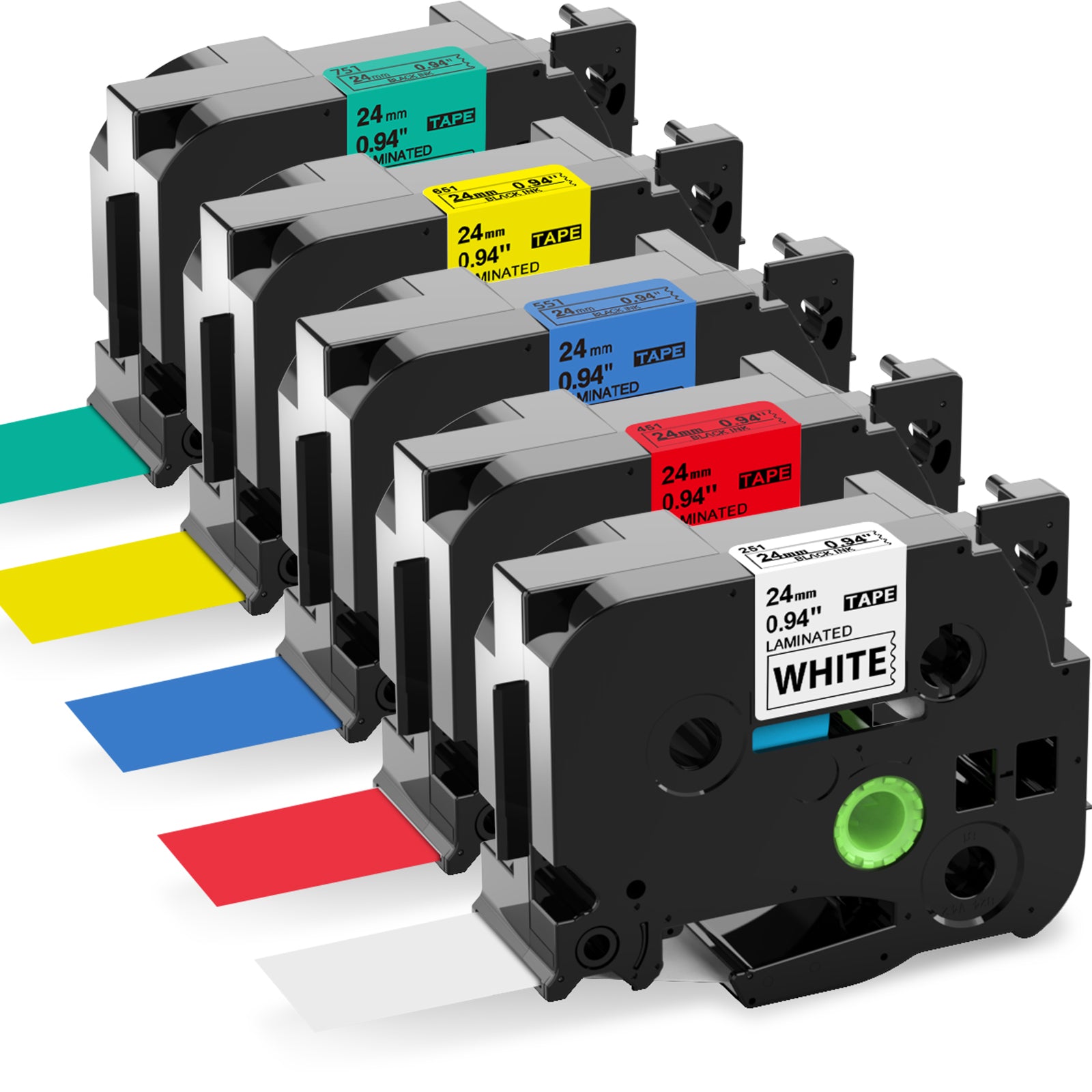 - 5 Pack Labelife compatible with Brother Ptouch 24mm TZe label tape TZe-251 (TZe251) (TZ-251) (TZ251). TZe-451 TZe-551 TZe-651 TZe-751. Width: 1 inch (24mm 0.94 inch). Length: 26.2 feet (8 meter) for each tape, 131 Feet for 5-Pack. 5 Color: Black on White/Black on Red/Black on Blue/Black on Yellow/Black on Green