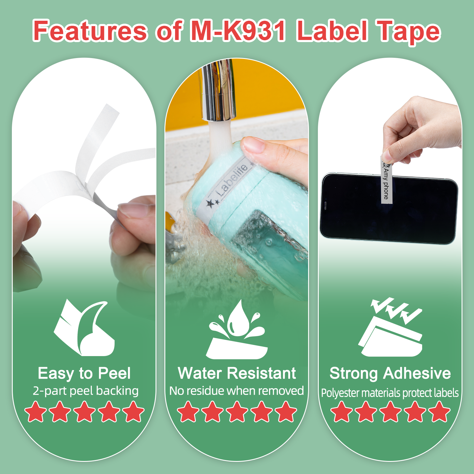 - [Features] The backing of m-931s label maker tape is purposely designed as 2 parts and has a slit in the middle to make it easy to peel from the middle than from the Side. Matte design makes reading easier. Bold printing will be clearer. Its polypropylene material makes it much more durable and water resistant than similar M931 Direct Thermal Non-laminated Tape. Strong adhesive and no sticky residue remains when removed.