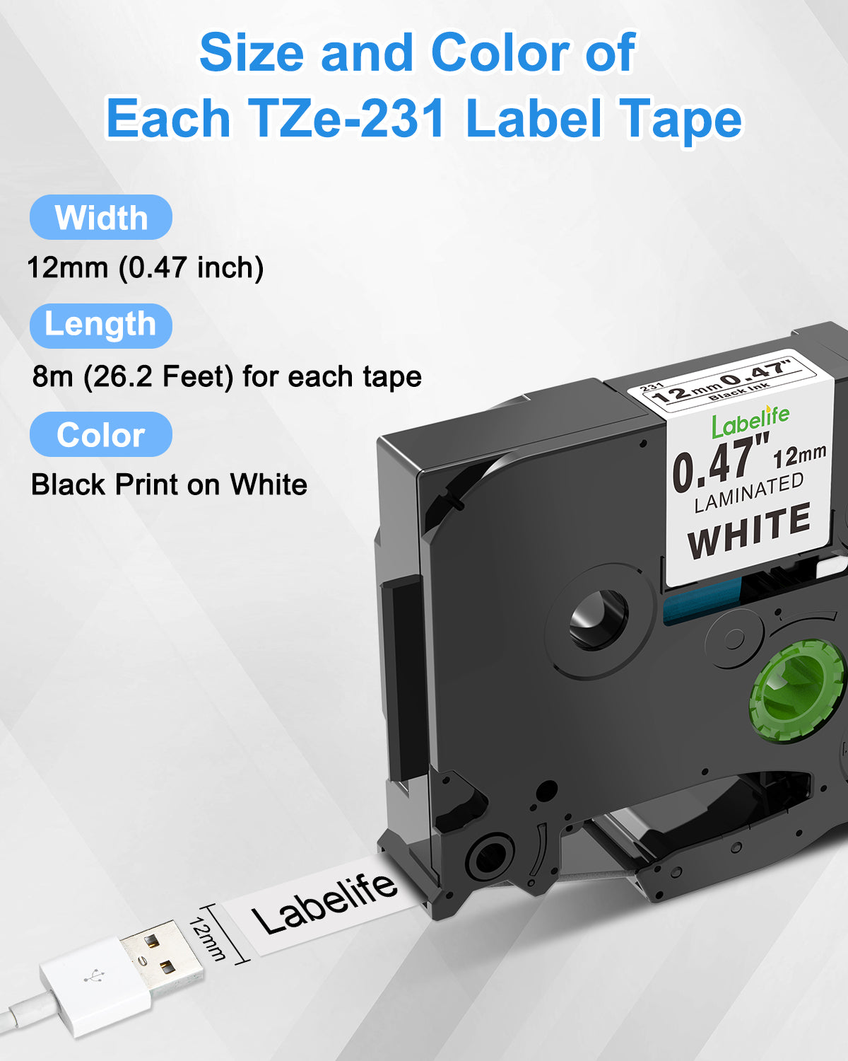 - 4-Pack compatible Brother P Touch label tapes TZe-231. Labelife AZe TZe TZ tape 12mm 0.47 laminated white label tapes AZe-231 are great replacement for Brother P Touch label tape TZe-231 TZe231