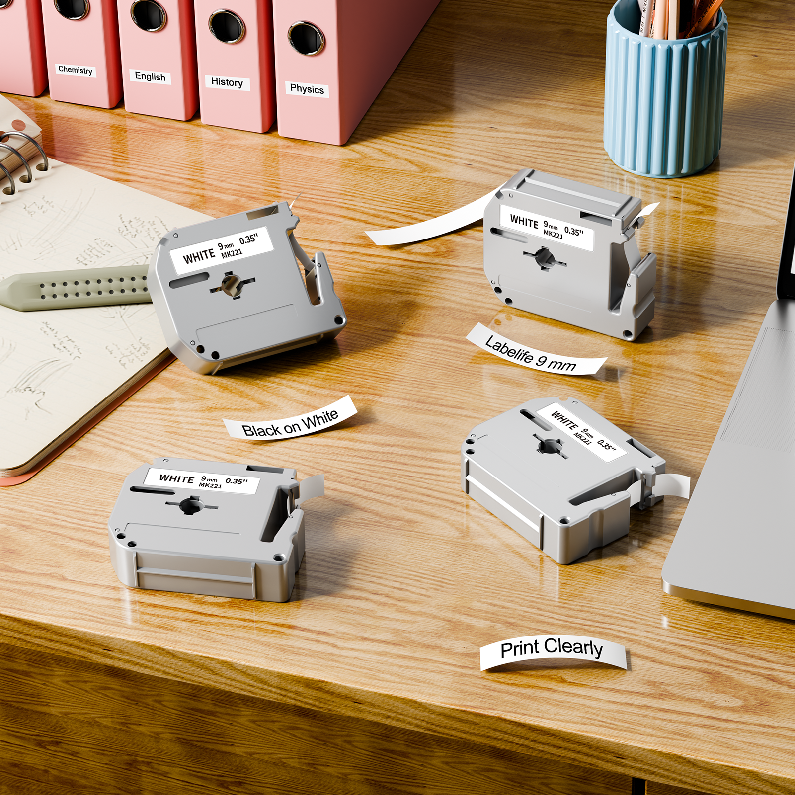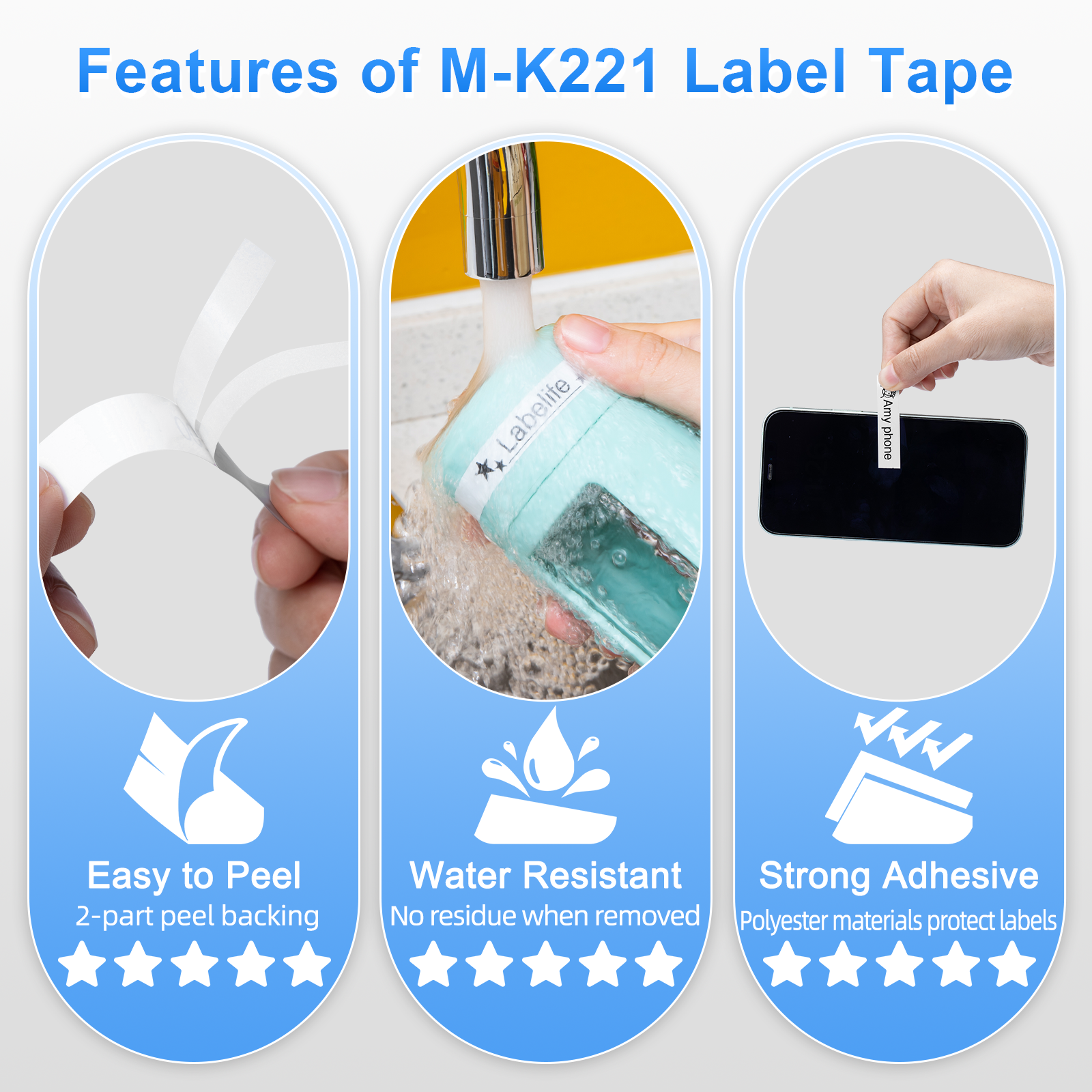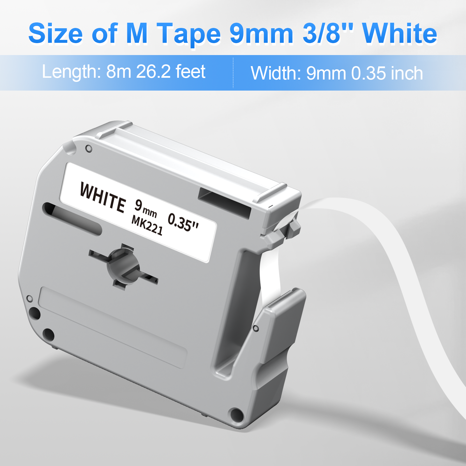 - [Features] The backing of m-k221 9mm white tape is designed as 2 parts to make it easy to peel from the middle than from the side. Matte design makes reading easier. Bold printing will be clearer. Its Polypropylene material makes it much more durable and water resistant than similar direct thermal label tape. Strong adhesive and no sticky residue remains when removed.