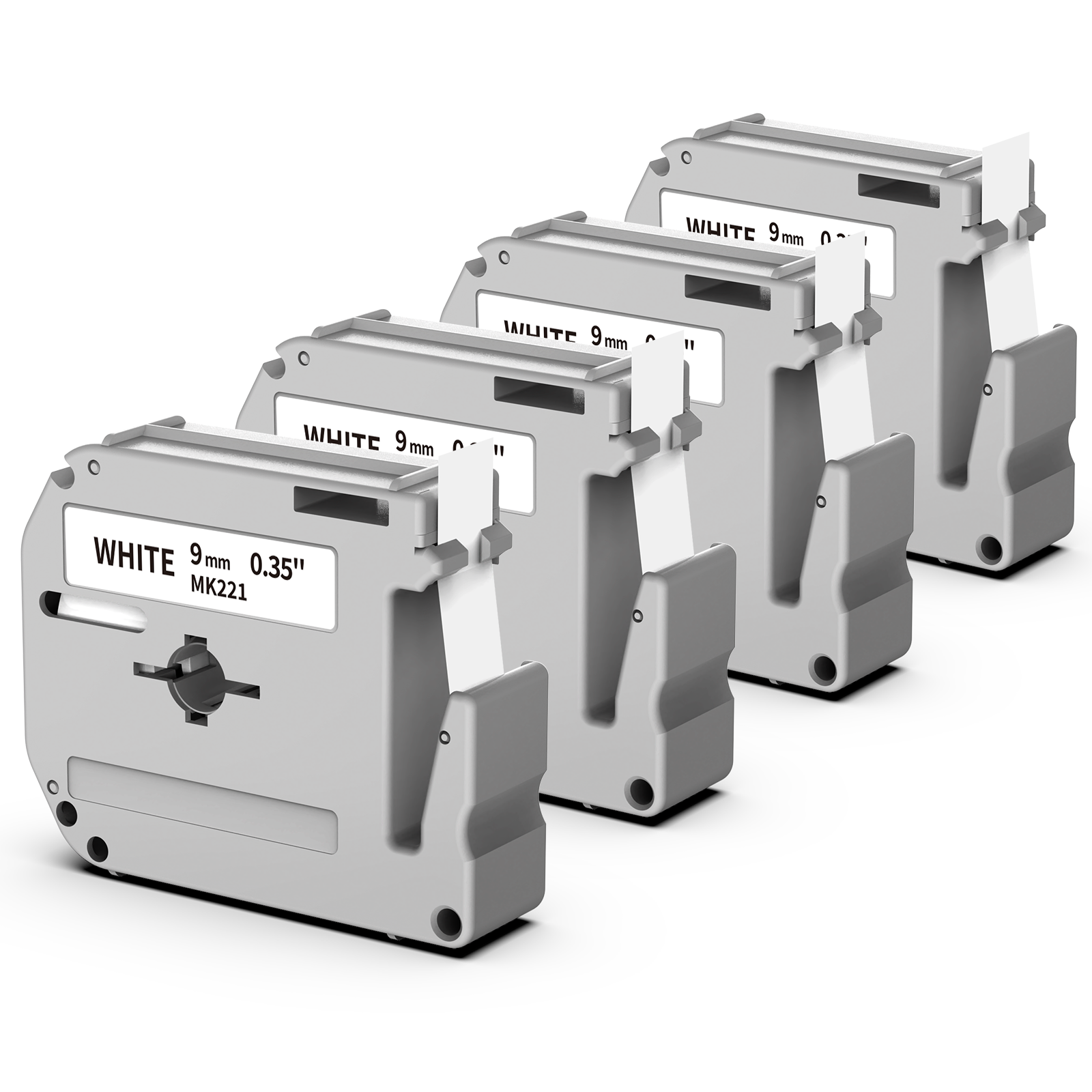 - [Package] 4 packs compatible with Brother p touch m tape m-k221 m221 mk221 m-221 m-k221s. Color: black print on white. Size: 9mm (3/8'') x 12mm (26.2'). Non-laminated tape.