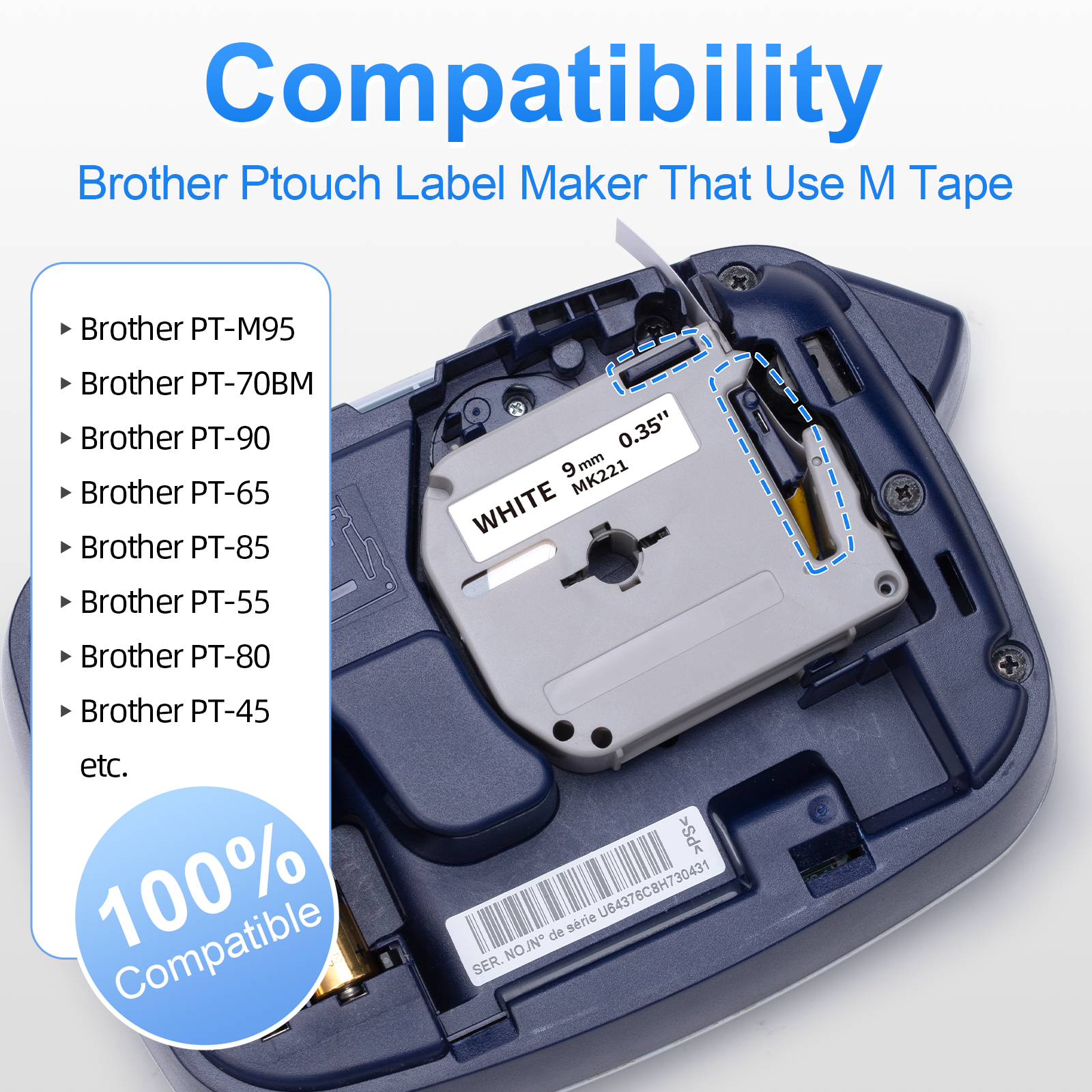 - [Compatibility] Compatible with Brother Ptouch Label Makers use M tape 9mm 3/8 inch that PT-M95, PTM95, PT-70BM, PT-65, PT-45, PT-90, PT-80, PT-85, PT-70, PT-45M, PT-55BM, PT-55S, PT-65SB, PT-65SCCP, PT-65SL, PT-65VP, PT-70BBVP, PT-70BMH, PT-70HK, PT-70HOL, PT-70HOT, PT-70SP, PT-70SR and more.