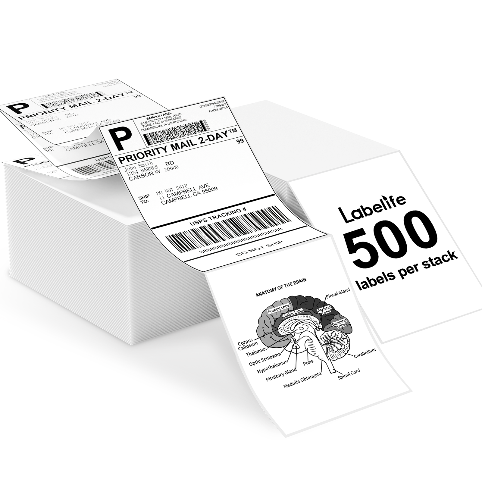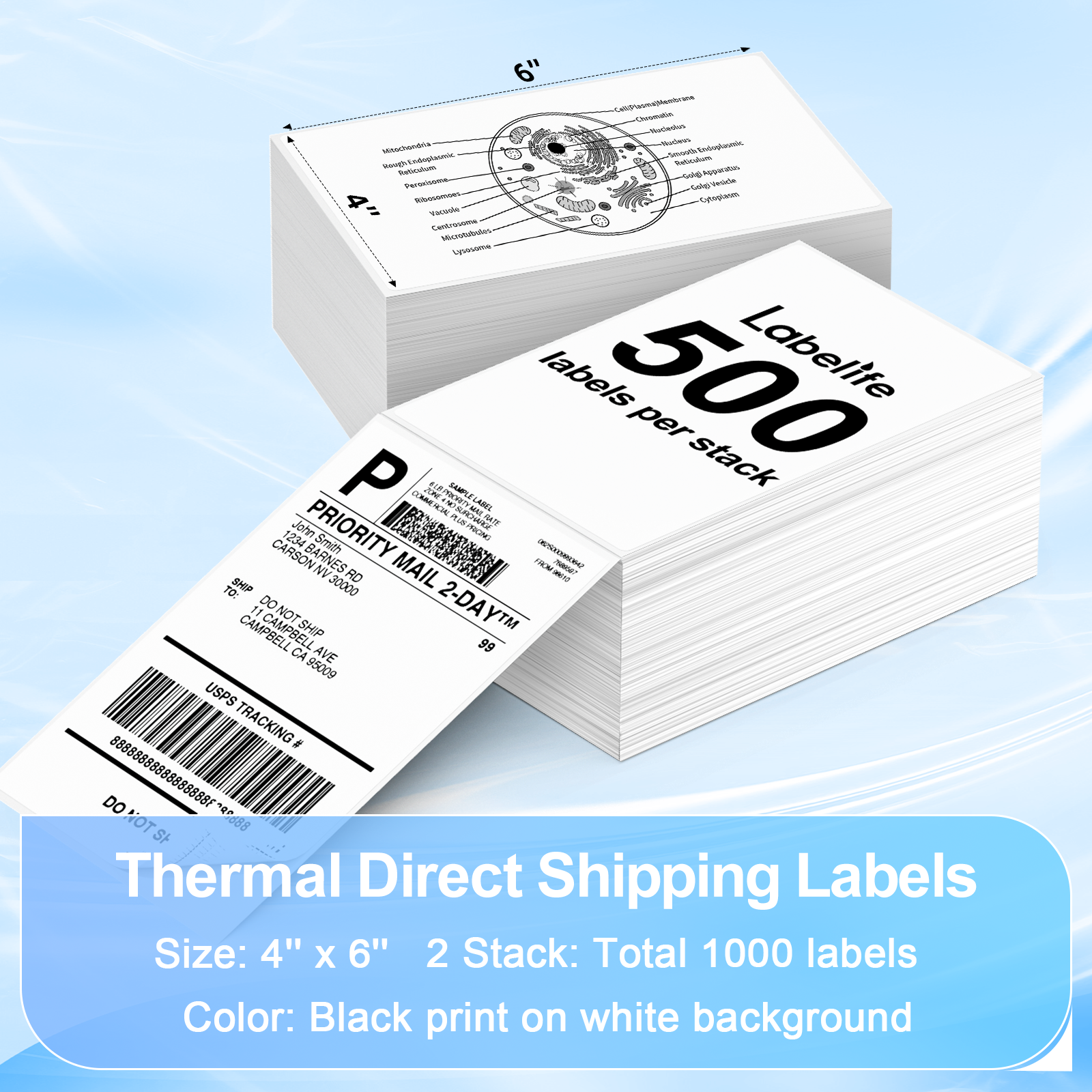 - [Details] Labelife 4 x 6 inch direct thermal shipping label (101.6mm x 152.4mm). Color: Black print on white. 2 stacks label roll, 500 labels per stack. Commercial grade fanfold shipping labels.