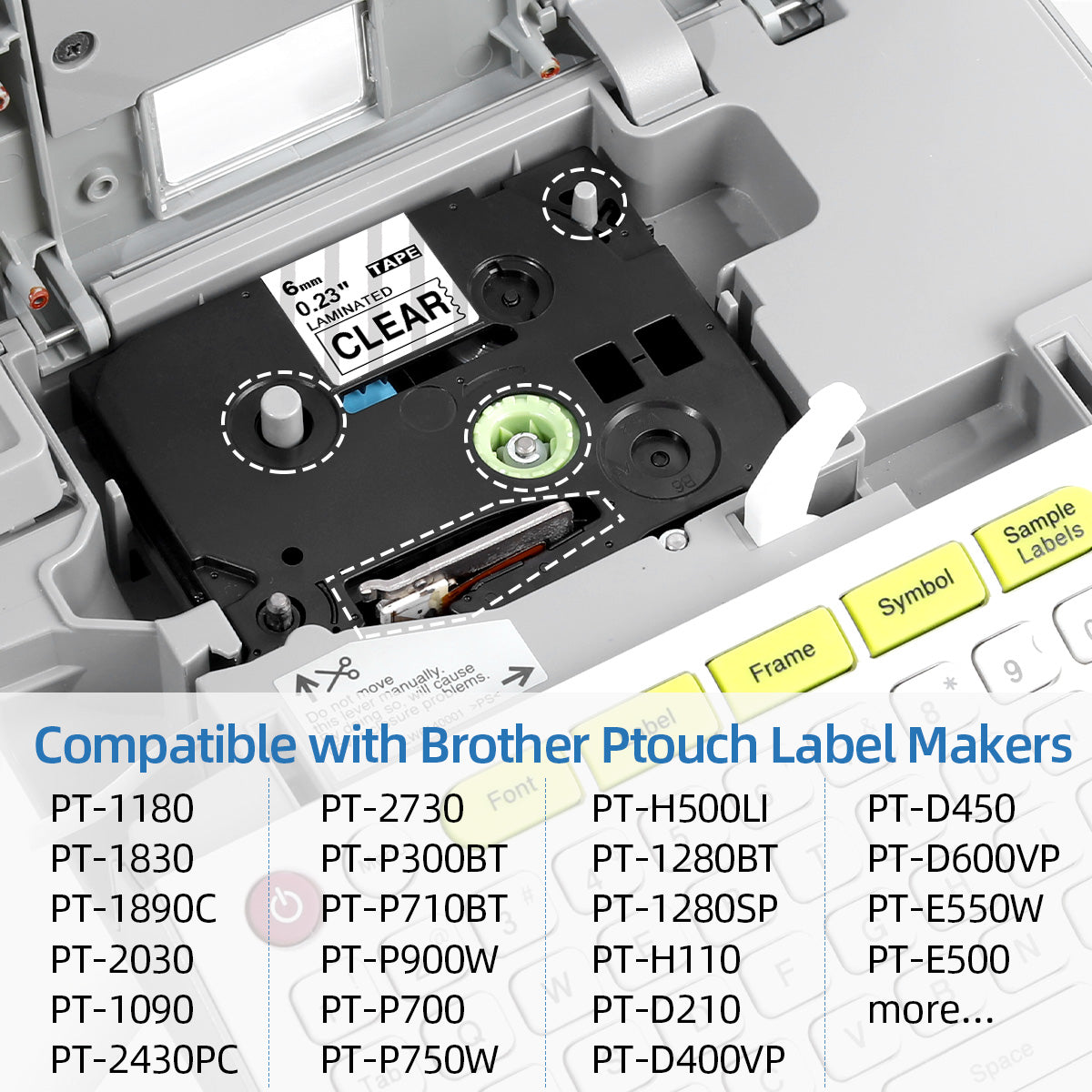 - Durability labels: Compatible with Brother p touch label maker 6mm clear tapes are laminated tape. It has features of water and oil resistant, abrasion resistant, temperature resistant, fade resistant, etc. Strong adhesive but zero sticky residue when removed. Split backing for easy peeling.