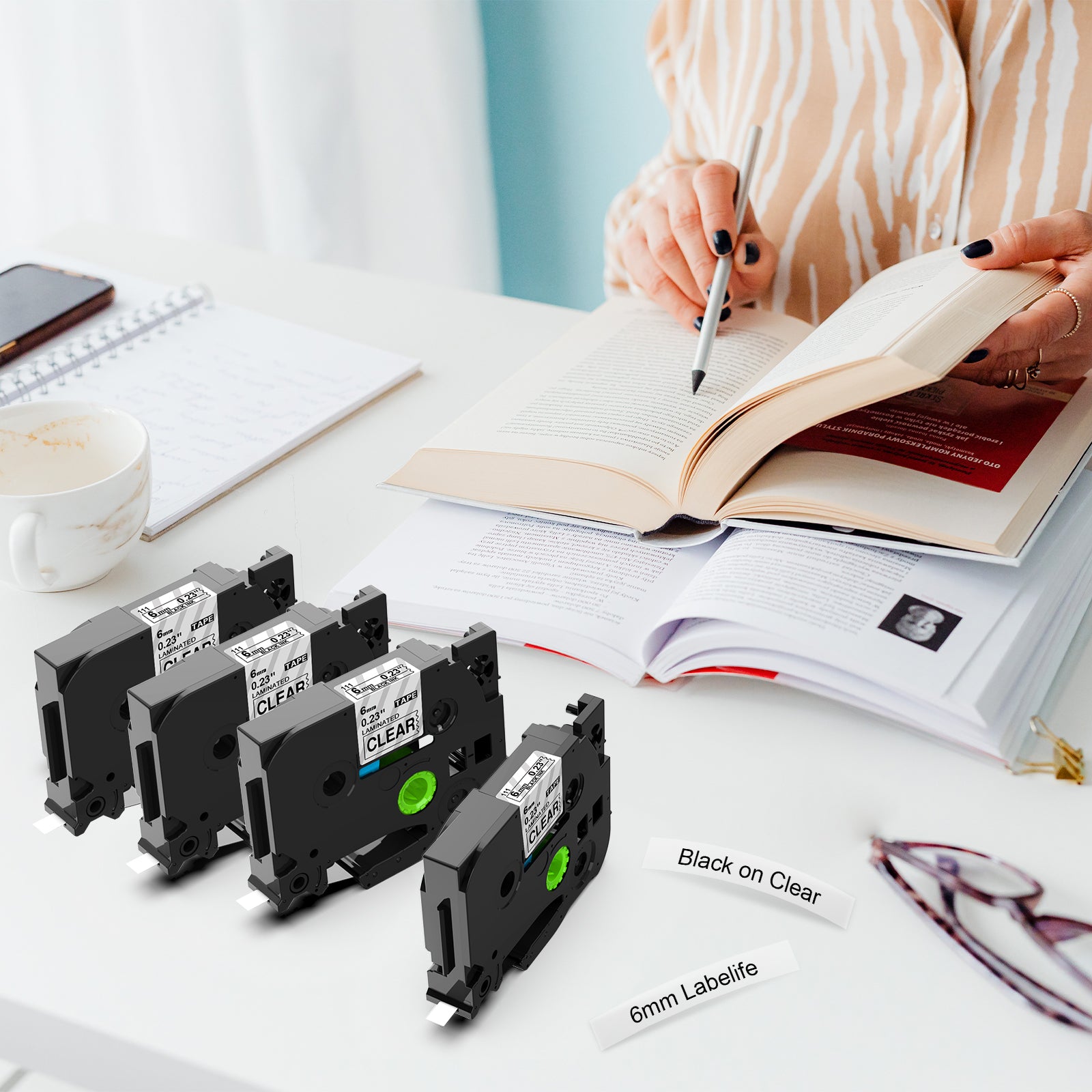 Labelife TZe-111 Compatible with Brother P Touch TZe TZ Tape 6mm 0.23 Laminated Clear 1/4'' Label Maker Tape for ptouch PTH110 PT-D200 PTD220 PTD400 PTD600, 4-Pack TZe111 TZ-111 Black on Clear