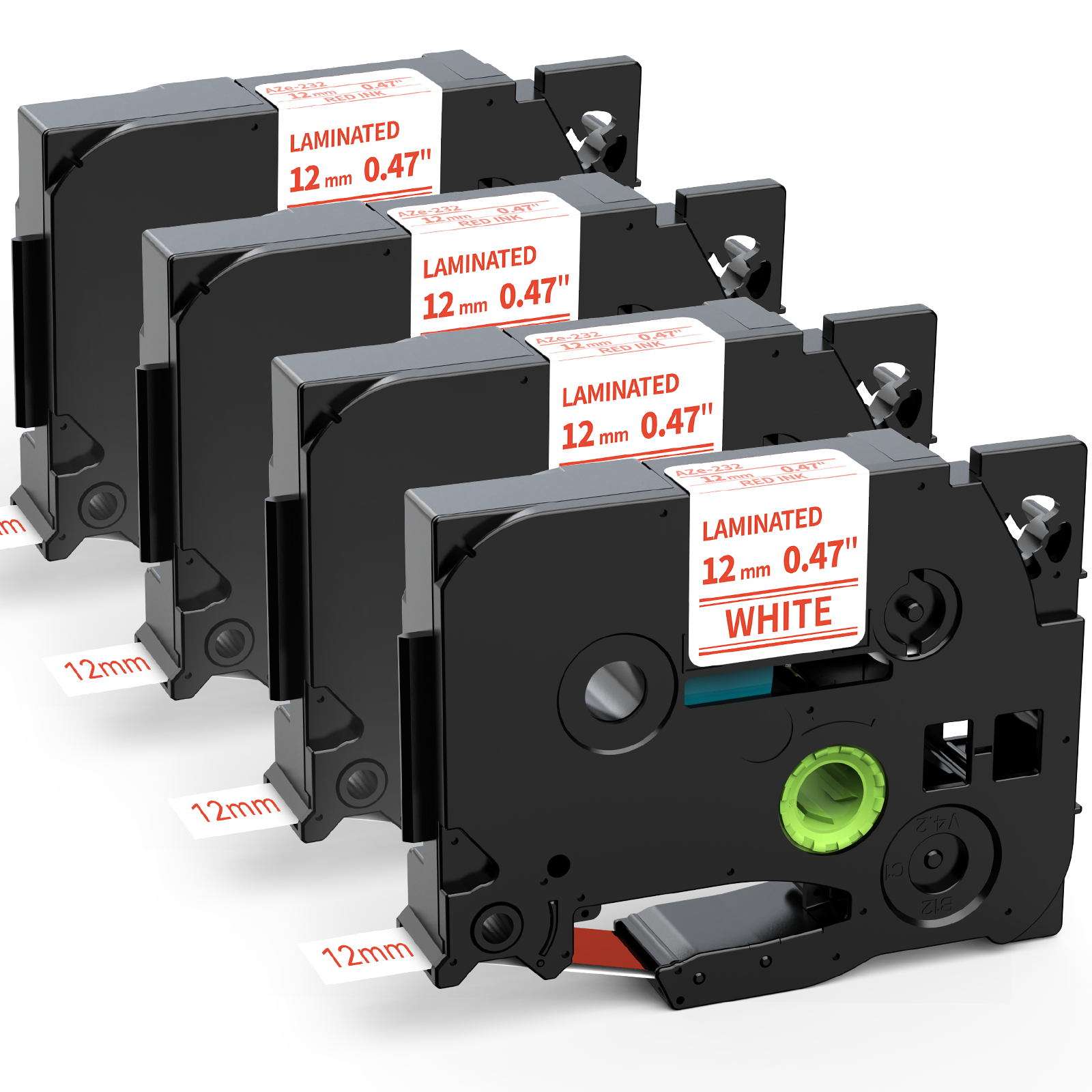 - Package: 4 packs compatible with Brother P Touch 12mm label maker tape TZe-232 (TZe232, TZ-232). Width: 1/2 inch (12mm 0.47 inch). Length: 26.2 feet (8 meter) for each label tape. Color: red on whtie.