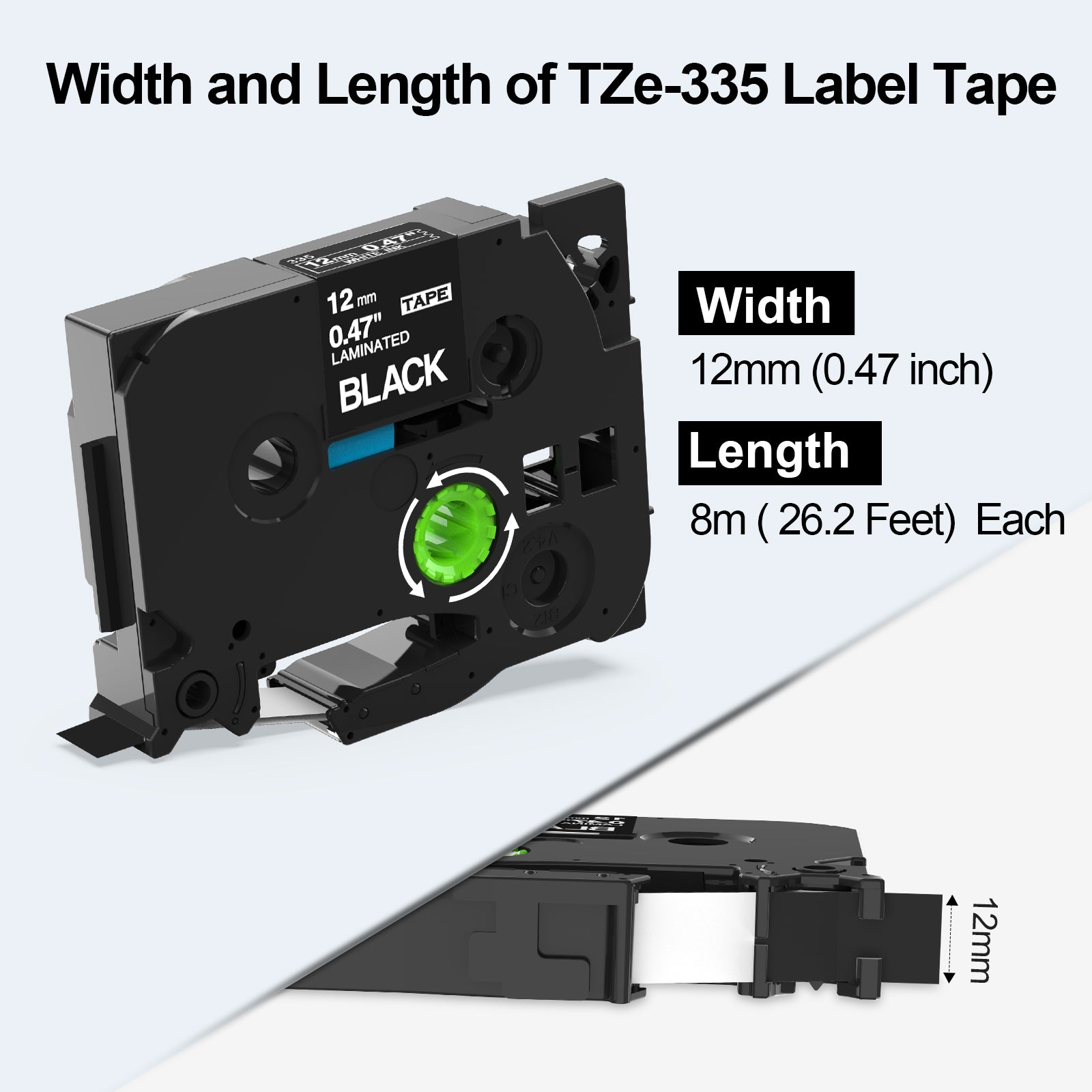 - Package includes 4-Pack Labelife label tape replacement for Brother P Touch label tape TZe-335 (TZe335). Color: White print on Black. Width: 1/2 inch (12mm 0.47 inch). Length: 26.2 feet (8 meter) for each TZe-335 label tape, 104.8 feet for 4-Pack TZe-335 label tapes. Not original.