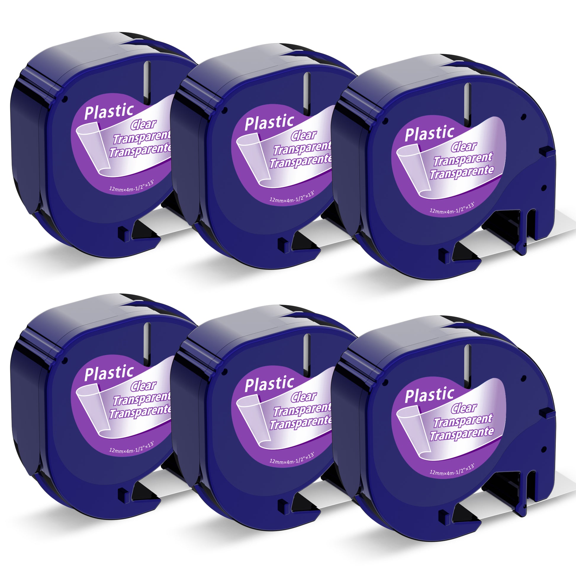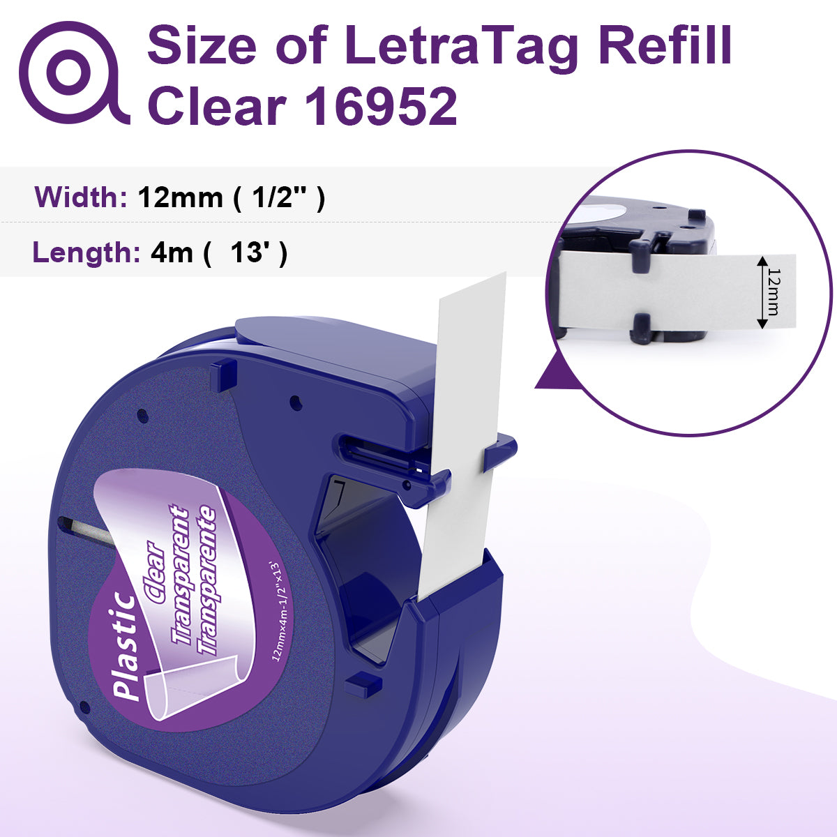 - [Package] 6 packs compatible with DYMO Letratag refills clear transparent. Model: 16952. Color: Black print on clear. Width: 1/2" (12mm) each, Length: 13' (4m) each lt label maker tape.