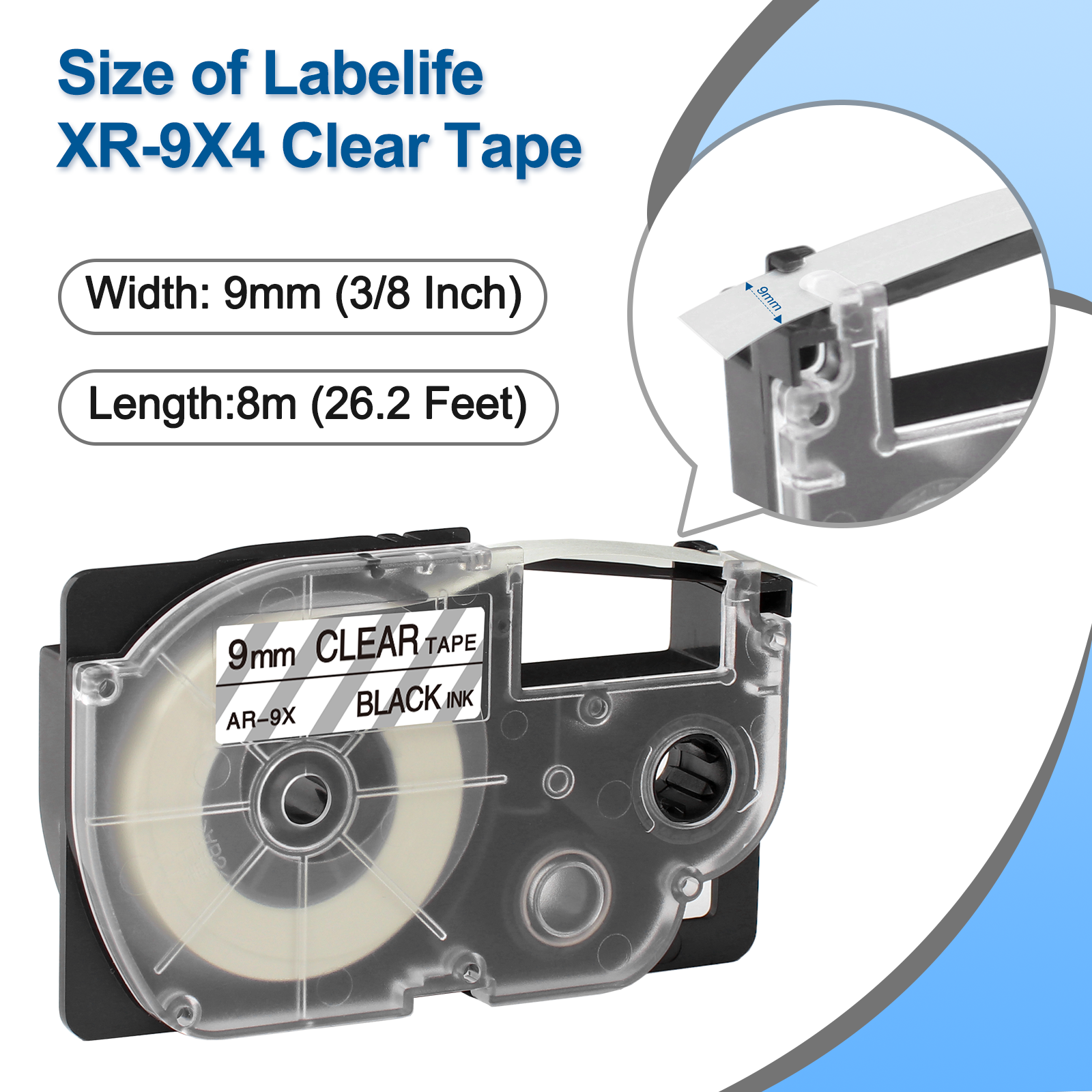 - [Package] 3 packs compatible with Casio label maker tape XR-9X XR-9X2S XR9X. Size and color of each label it tape: 3/8" x 26 " (9mm x 8m), black on clear. Self-adhesive tapes.